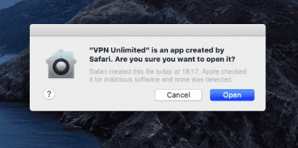 Wenn Sie VPN Unlimited zum ersten Mal starten, erhalten Sie möglicherweise die folgende Meldung. Klicken Sie auf Open (Öffnen), um fortzufahren