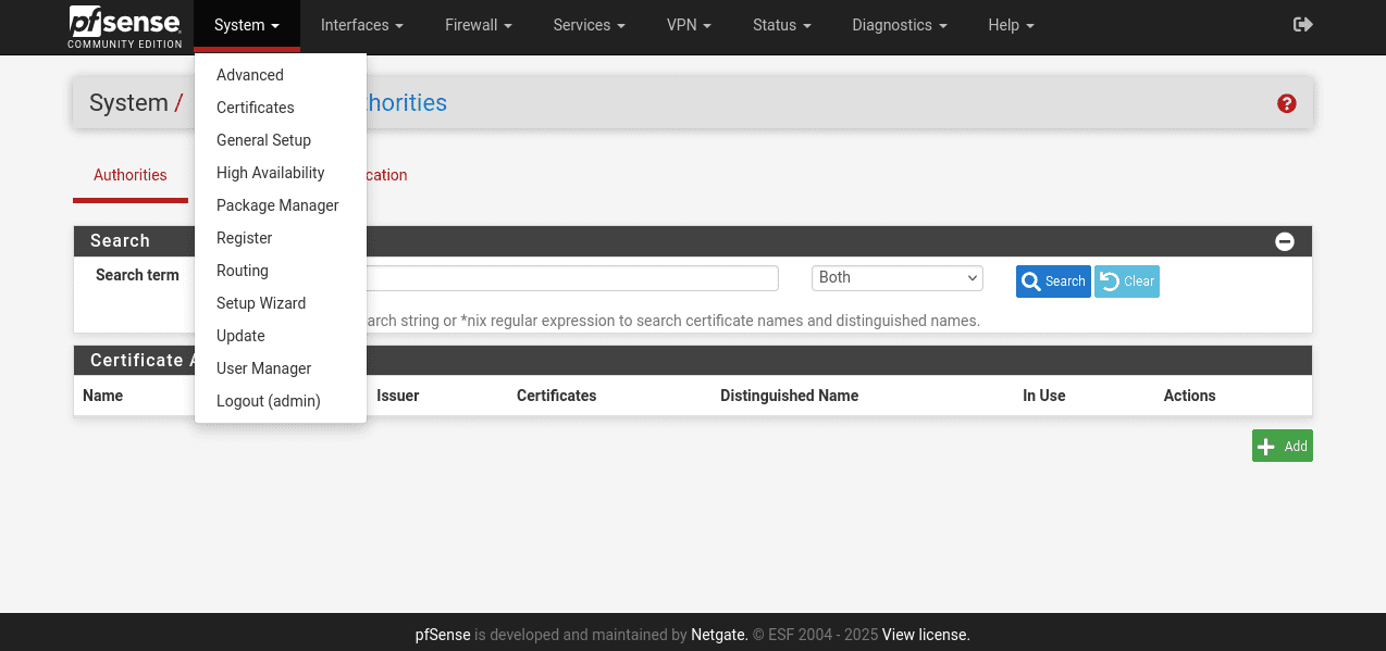 ۱. رابط روتر pfSense خود را باز کنید و بروید به System (سیستم) > Certificates (گواهیها) > Authorities و روی Add (افزودن) کلیک کنید.