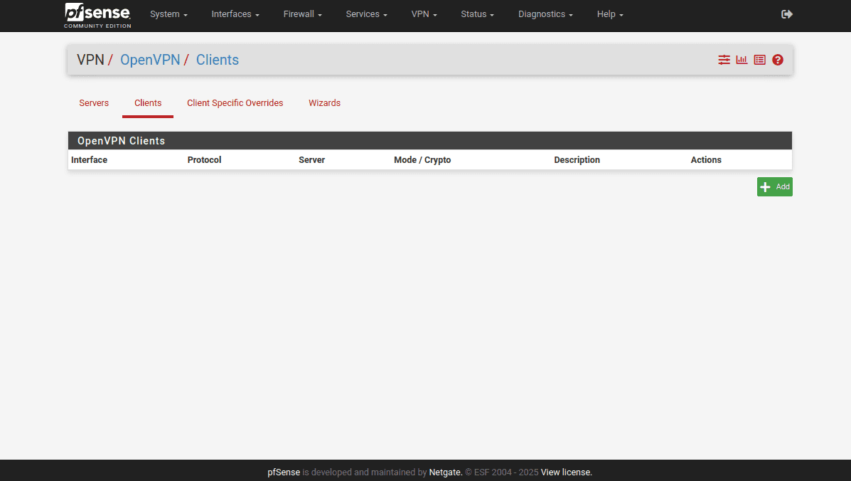 ۷. بروید به VPN > OpenVPN > Clients (گیرندهها) و روی Add (افزودن) کلیک کنید.