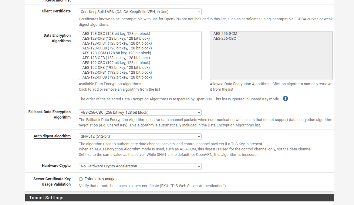 - Client Certificate (گواهیِ گیرنده): در لیست کشویی گواهیِ VPN Unlimited را انتخاب کنید