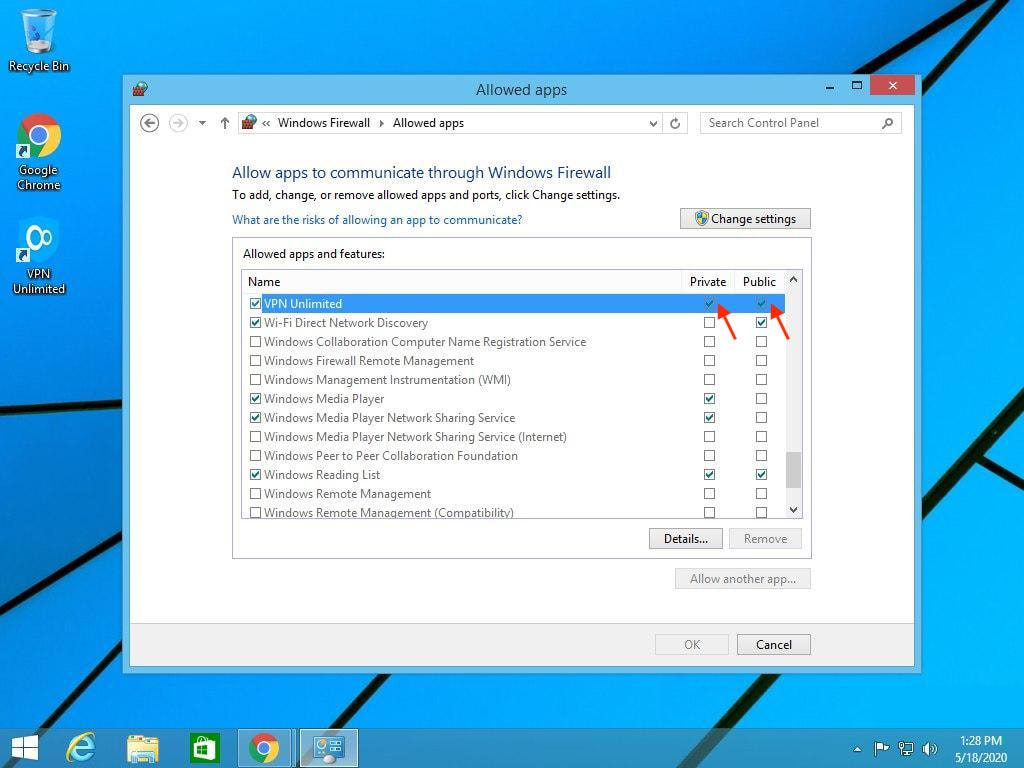 Find VPNUnlimited in the list, click the Change settings button, and set both checkboxes for VPN Unlimited and OpenVPN. Then click OK.