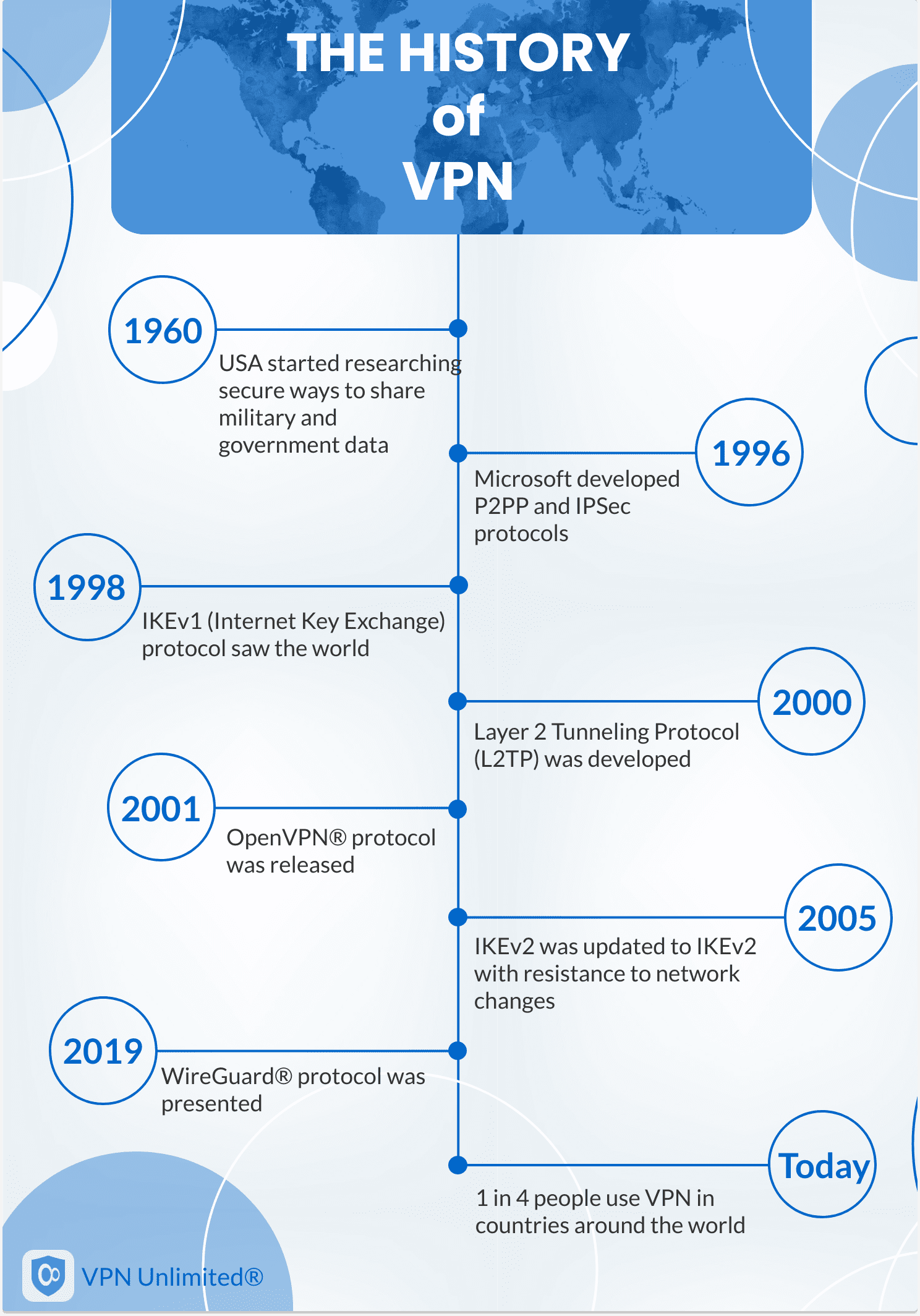 The history of Virtual Private Networks starts back in the 1960s when the internet was launched. U.S. Department of Defense started researching secure ways to share military and government information and implementing electronic methods of remote communication.