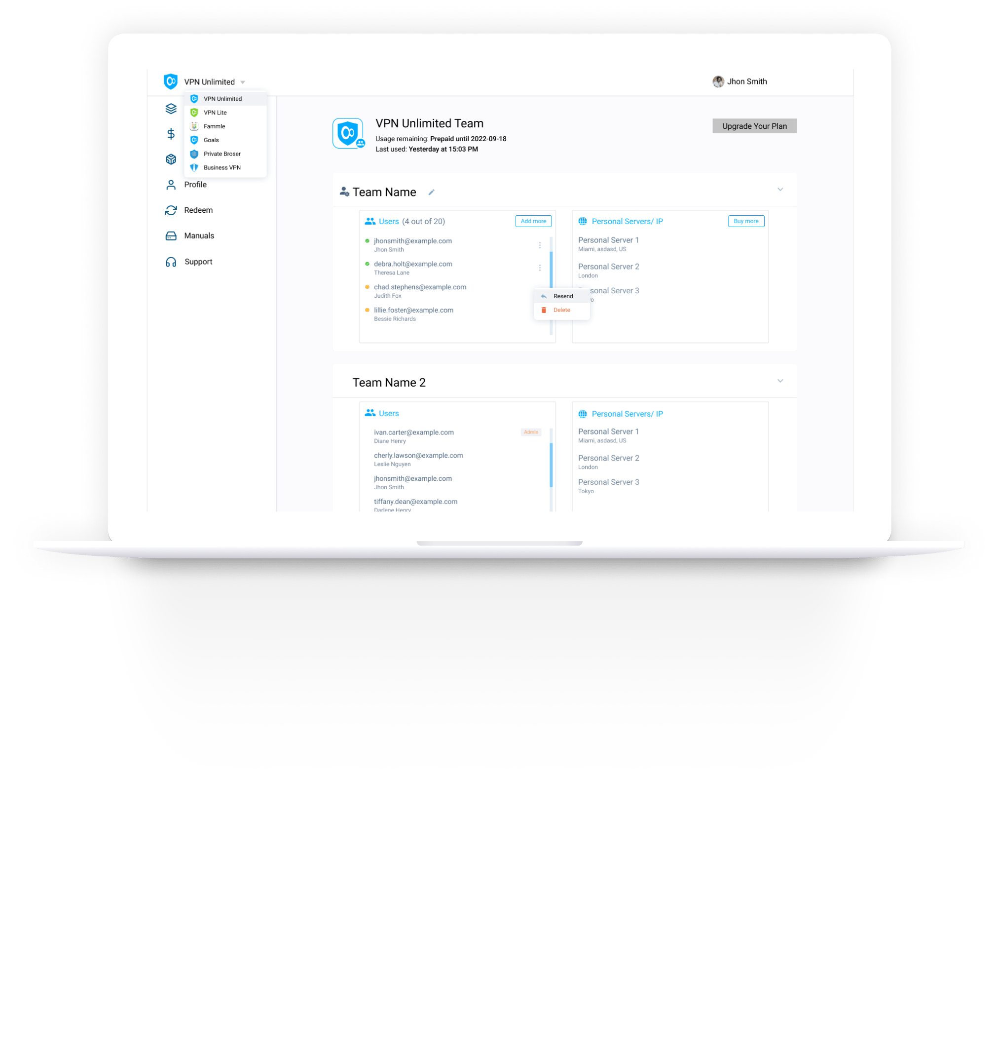 Управление членами вашей команды очень просто с VPN Unlimited для команд! Выделенная панель управления позволяет добавлять и удалять пользователей, обновлять тарифный план, чтобы расширить команду, и многое другое. И все это - прямо со страницы вашего кабинета пользователя!